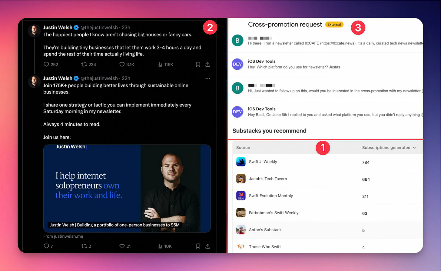 Find newsletters on different platforms, reach out to their creators, and ask if they’re interested in cross-promotion. If people find your newsletter interesting, they’ll subscribe. Simple as that. (Check image with #3 below).