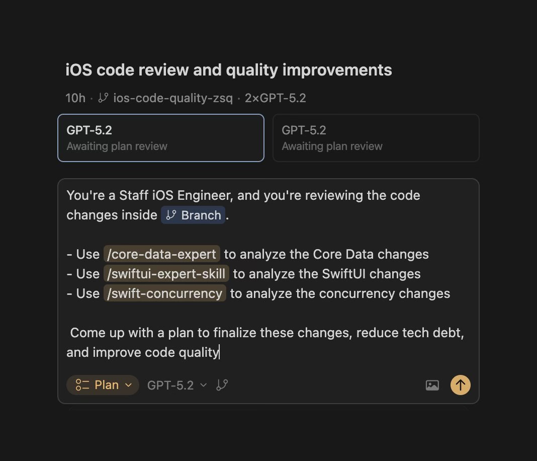 For the latter, I’m currently using my personal skills for SwiftUI, Swift Concurrency, Core Data, and Swift Testing. All these skills are based on my code projects, articles, and course lessons. The review prompt reference these skills makes sure that the local changes are close to what I would write myself. Here’s an example: